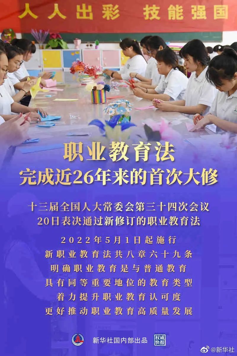 重磅!近26年来首次大修:新版《中华人民共和国职业教育法》5月1日起施行!(内附全文)